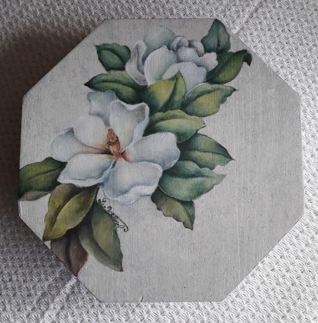 Ce dessous de plat octogonal en bois est une création unique, peinte à la main et signée. Son fond en bleu pastel, travaillé avec la technique expressive de la poche plastique, apporte texture et profondeur — comme une brume légère où s’épanouissent de délicats gardénias.