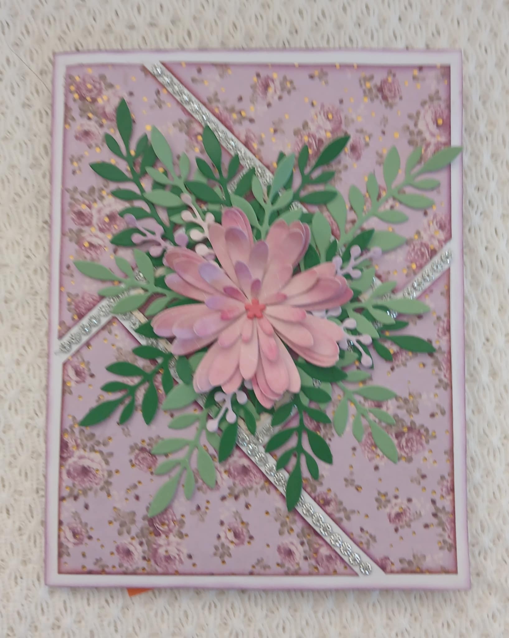 Description poétique : Une marguerite rose, généreuse et rayonnante, s’épanouit au centre de cette carte comme une offrande de lumière.