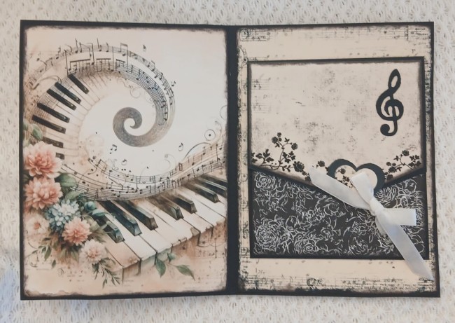 Intérieur : spirale musicale, fleurs pastel, poche décorative avec nœud